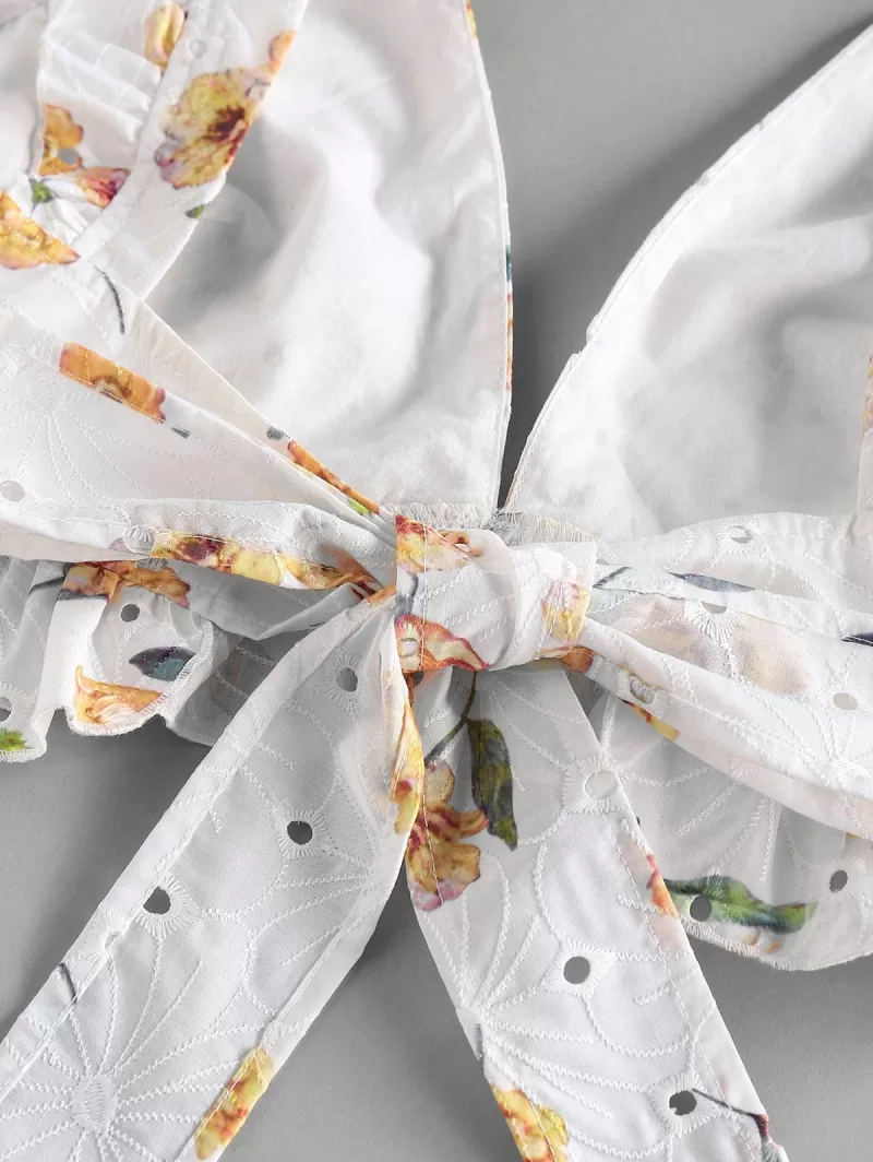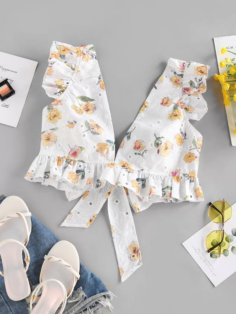 Broderie Anglaise Flower Print Ruffle Crop Blouse
