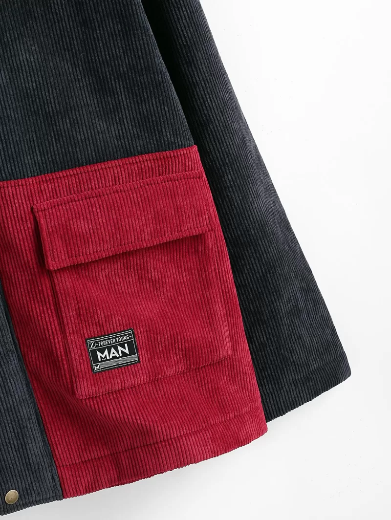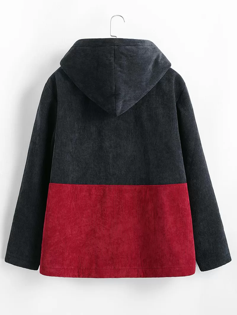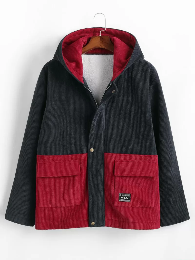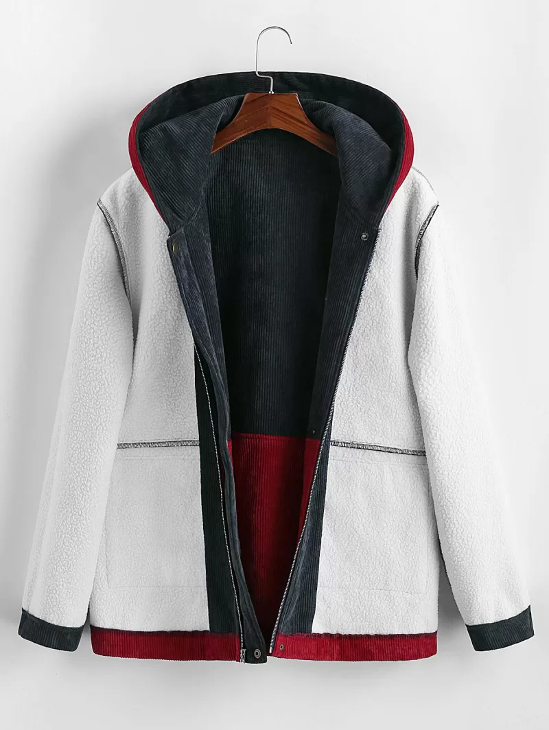 Hooded Double Pockets Contrast Corduroy Fleece Jacket